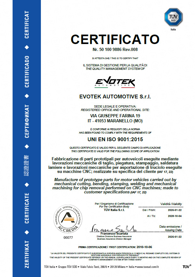 Azienda Certificata ISO 9001 per "Fabbricazione di parti prototipali per autoveicoli eseguite mediante lavorazioni meccaniche di taglio, piegatura, stampaggio, saldatura lamiere e lavorazioni meccaniche per asportazione di truciolo eseguite su macchine CNC; realizzate su specifica del cliente".